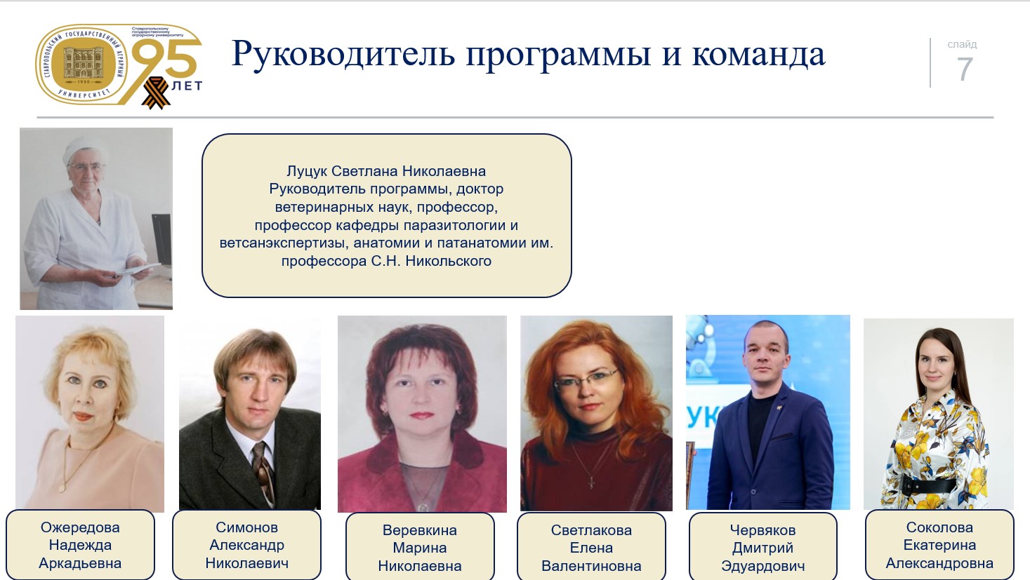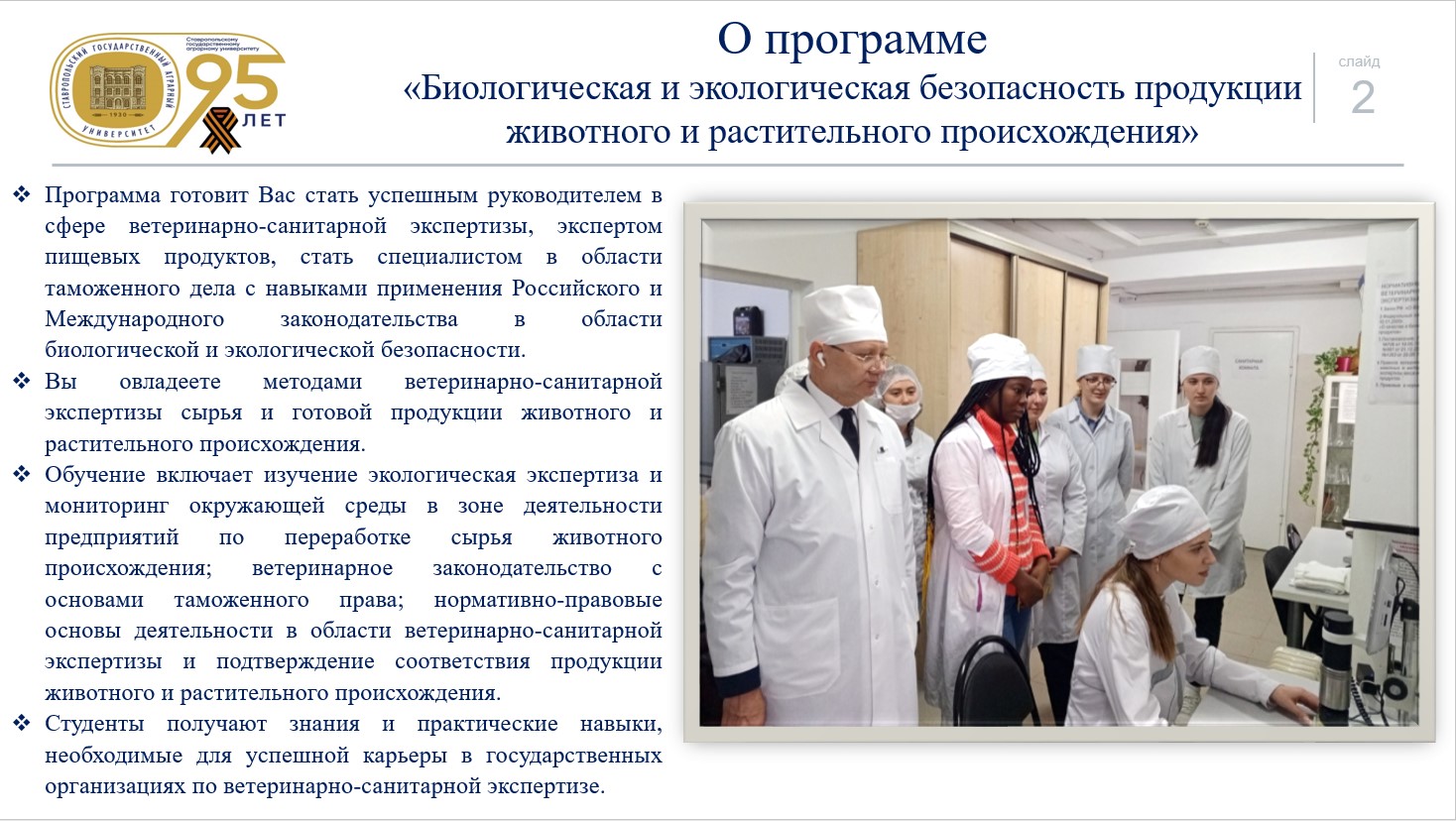 Программа «Биологическая и экологическая безопасность продукции животного и растительного происхождения» готовит стать успешным руководителем в сфере ветеринарно-санитарной экспертизы, экспертом пищевых продуктов, специалистом в области таможенного дела с навыками применения Российского и Международного законодательства в области биологической и экологической безопасности. Вы овладеете методами ветеринарно-санитарной экспертизы сырья и готовой продукции животного и растительного происхождения. Для формирования кадрового потенциала региона к занятиям привлечены ведущие научные школы в лице докторов и кандидатов ветеринарных, и биологических наук.