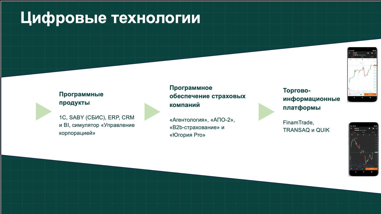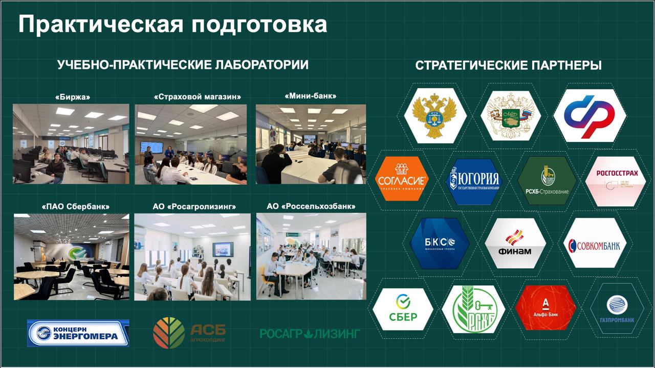 На ознакомительной практике предоставляется возможность прокачать навыки биржевой торговли, страхового и банковского дела на базе лабораторий «Биржа» и «Страховой магазин», специализированных лабораторий Сбербанка, Россельхозбанка, Росагролизинга.